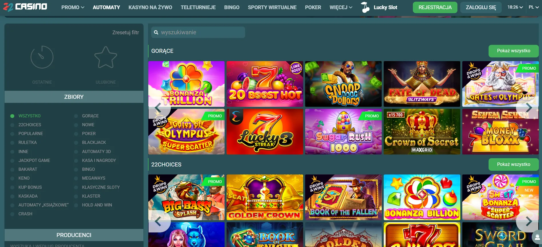 Katalog gier? Kilka tysięcy automatów – klasyczne owocówki, nowoczesne automaty wideo, gry z jackpotami progresywnymi. Sekcja “22CHOICES” pokazuje najciekawsze tytuły wybrane przez zespół kasyna. Kategorie obejmują: