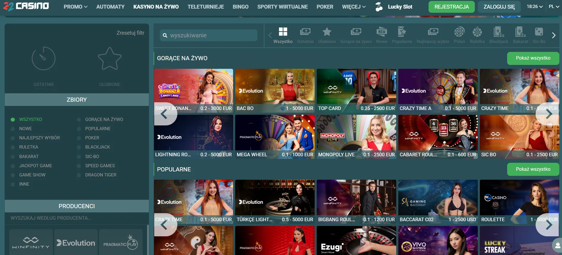 Tysiące gier od czołowych producentów z całego świata, rozbudowana sekcja live z baccarat live, ruletką i blackjackiem z profesjonalnymi krupierami. 22 Casino aplikacja zapewnia mobilność – gra na urządzeniach mobilnych z zachowaniem funkcji desktopa.