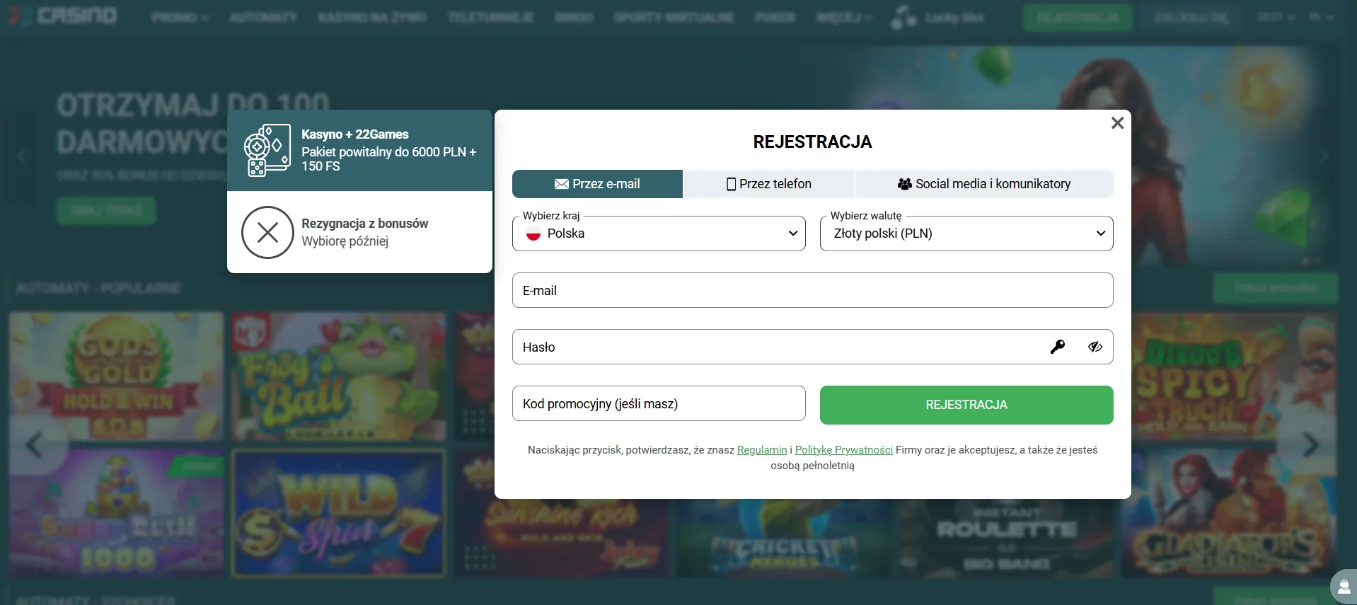Rejestracja konta w 22 Casino działa przez e-mail, telefon albo social media. Każda metoda równie bezpieczna.