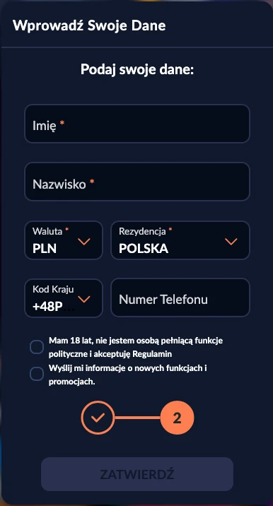 Wybierz kraj zamieszkania, preferowaną walutę (PLN dla polskich graczy), podaj datę urodzenia i płeć. Zaznacz pole akceptacji Regulaminu kasyna.
