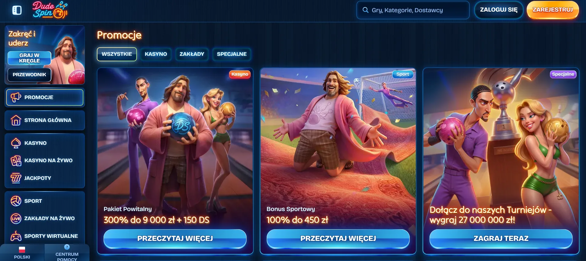 Co wyróżnia Kasyno Dudespin? Przede wszystkim bogatą ofertą gier i system bonusów. Pakiet powitalny sięga 300% do 2000 EUR plus 150 darmowych spinów – solidna paczka na start. Platforma akceptuje złotówki, więc polskich graczy nie czeka żadna gimnastyka z przeliczaniem walut.