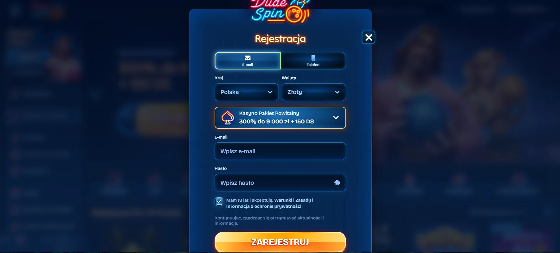 Wejdź na stronę kasyno Dudespin i kliknij “Zarejestruj się”