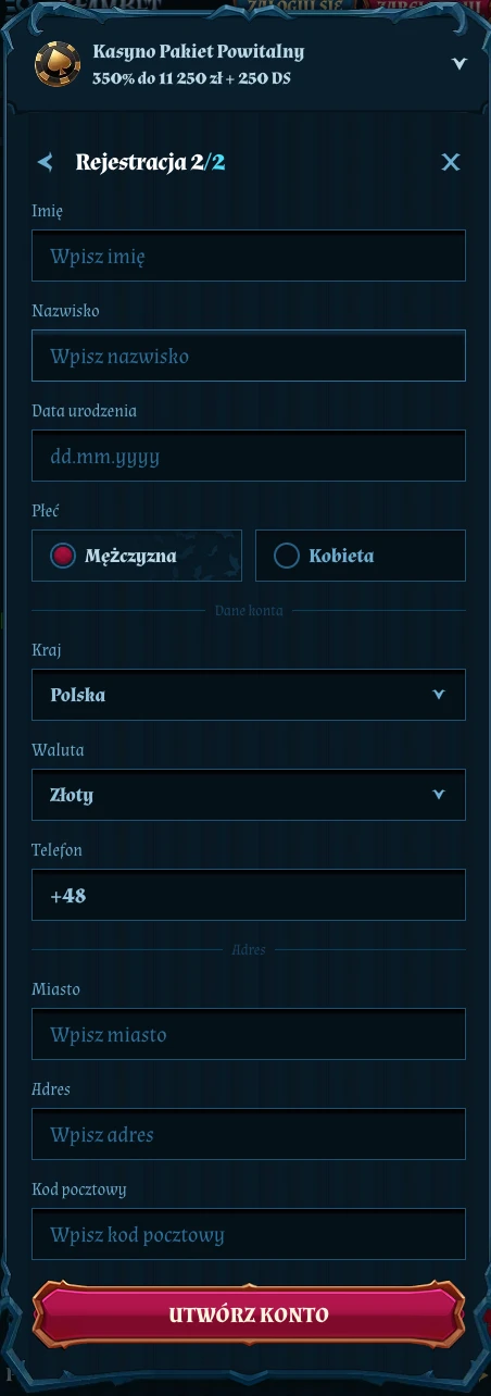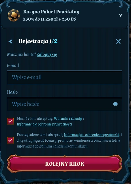 Opcjonalnie zaznacz zgodę na otrzymywanie informacji marketingowych o bonusach i promocjach