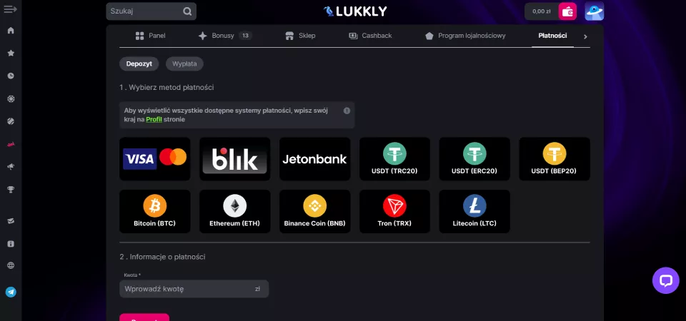 Płatności w Lukkly obejmują popularne opcje: karty płatnicze, BLIK i kryptowaluty. Każda transakcja jest zabezpieczona nowoczesnym szyfrowaniem.