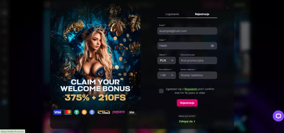 Wejdź na stronę internetową Lukkly Casino i kliknij “Rejestracja”