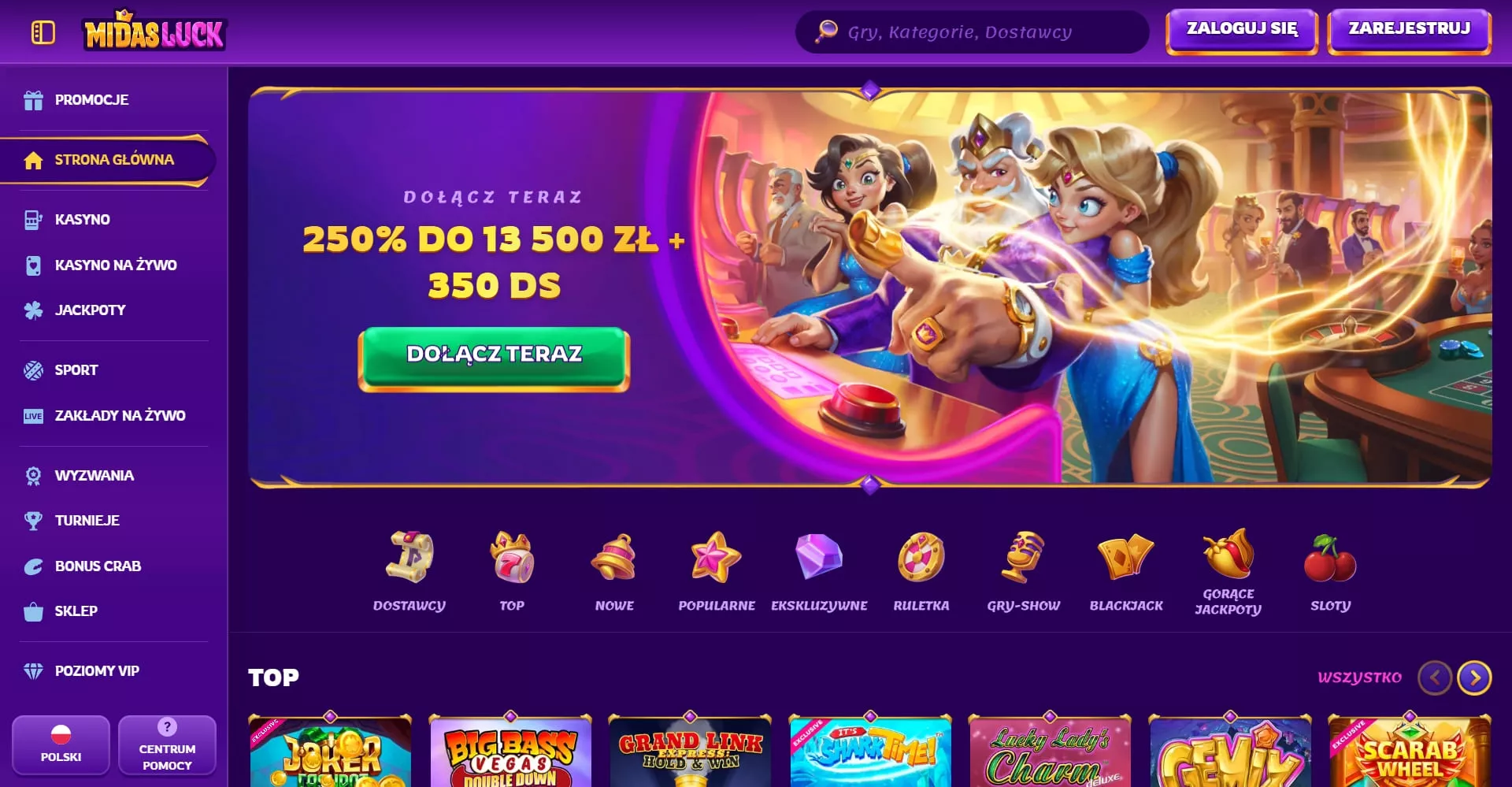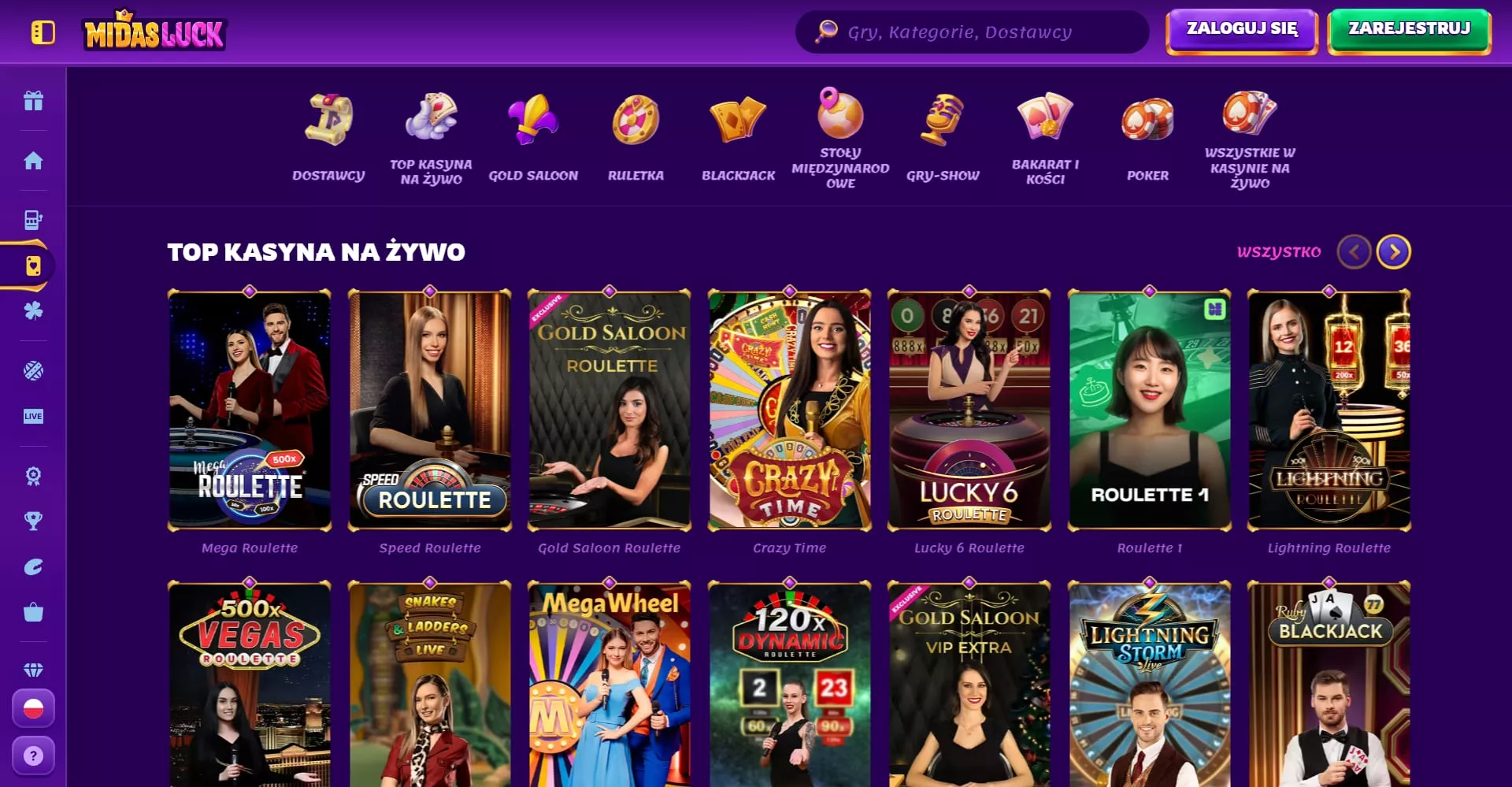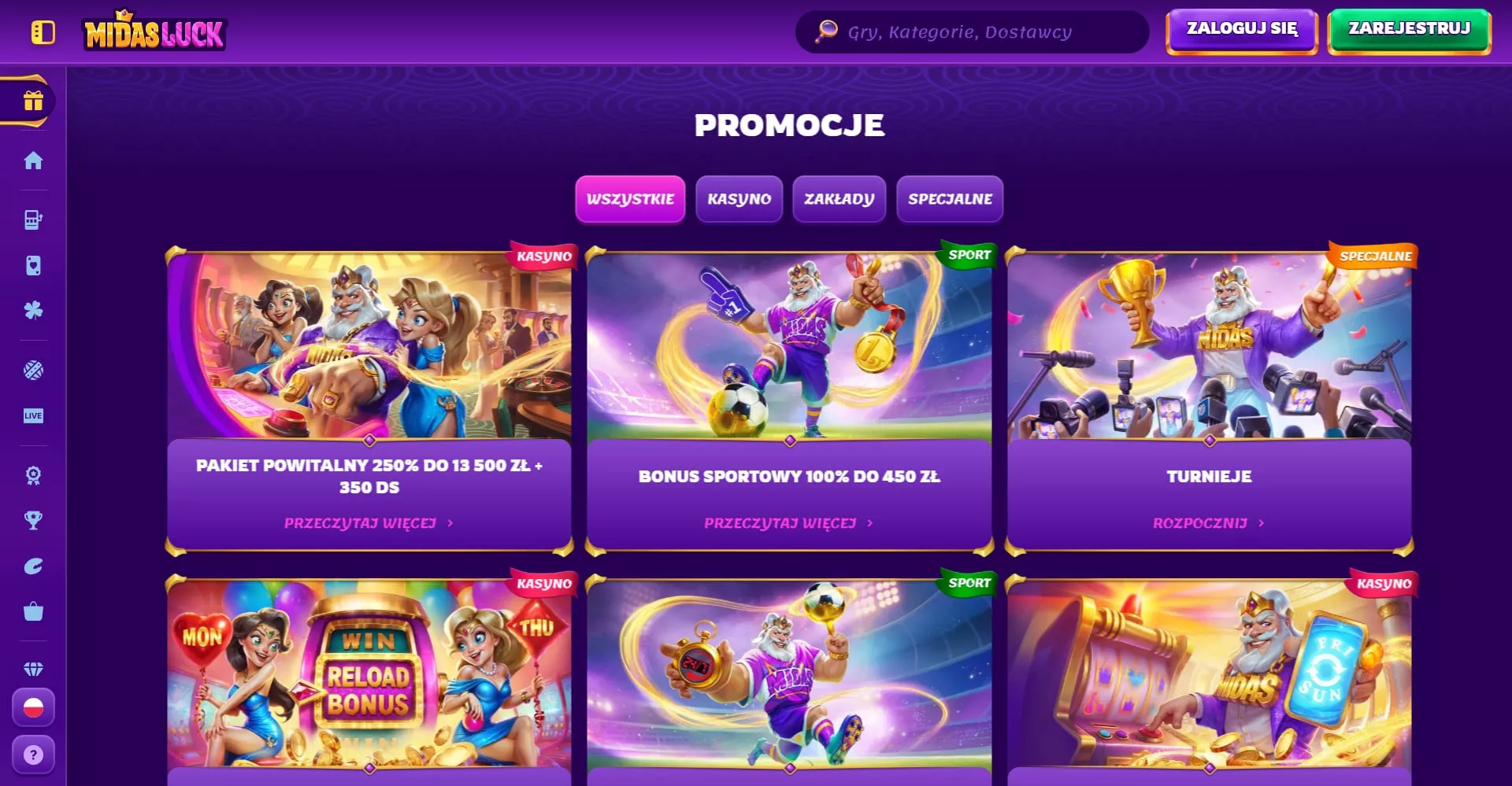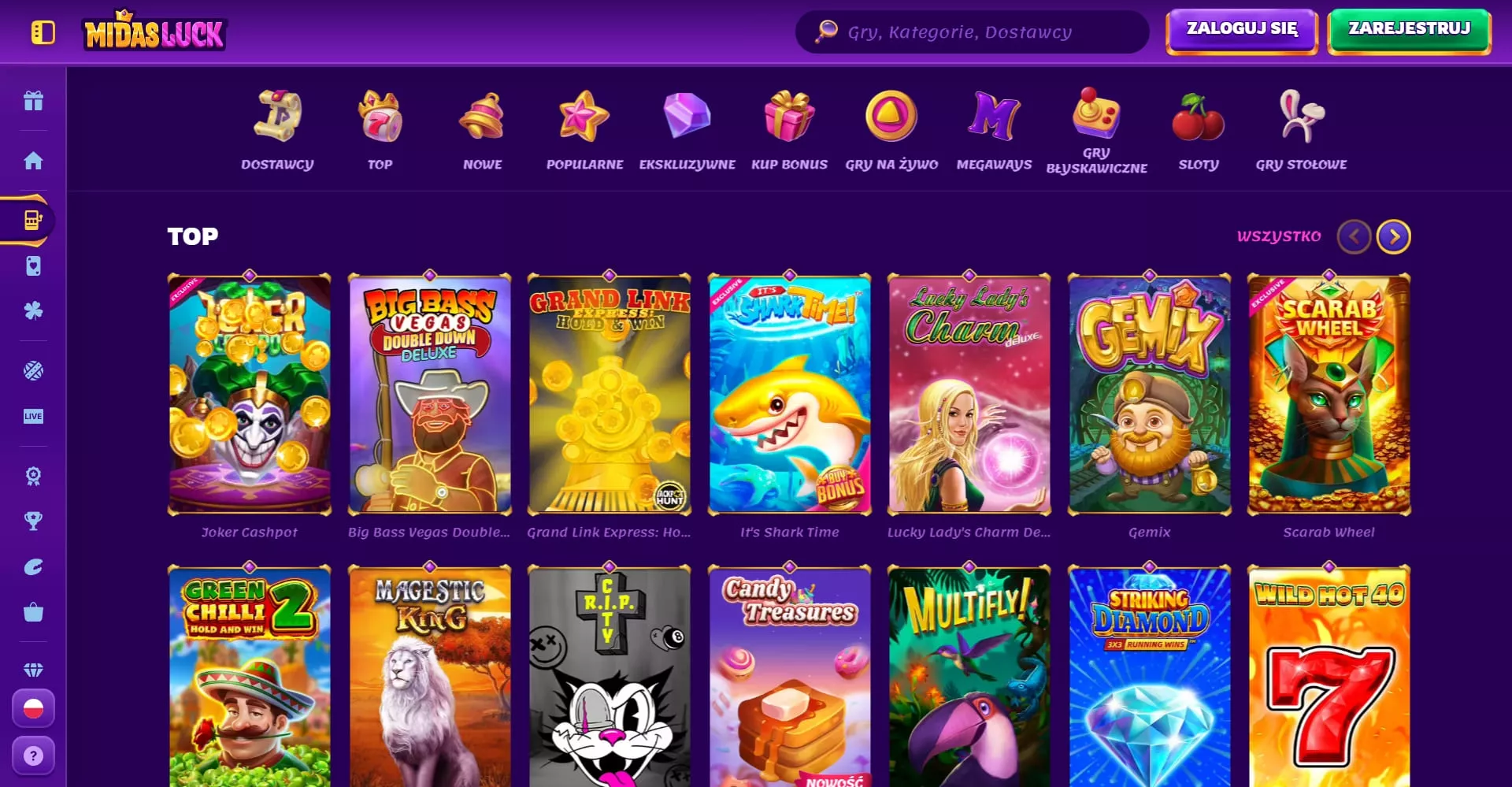 Świat gier w MidasLuck jest podzielony na kilka głównych sekcji: