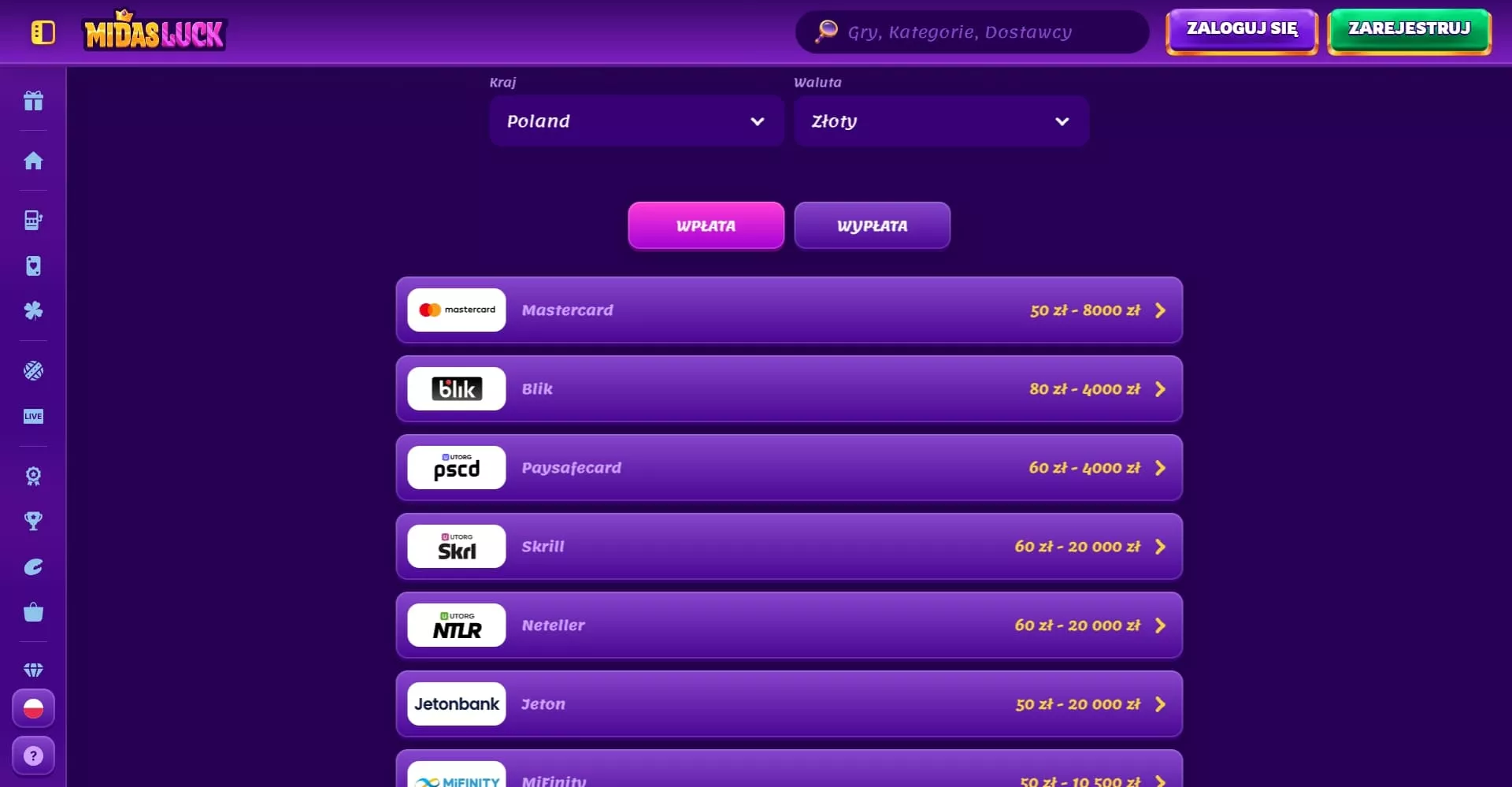 MidasLuck ma 17 metod na depozyty i 15 na wypłaty. Są karty (MasterCard), BLIK, Paysafecard, portfele elektroniczne (Skrill, Neteller), MiFinity, Jetonbank i kryptowaluty (Bitcoin, Ethereum, Litecoin, Tether). Przelewy bankowe działają tylko do wypłat, co jest trochę dziwne. Kasyno nie pobiera opłat, ale dostawca płatności może mieć swoje prowizje.