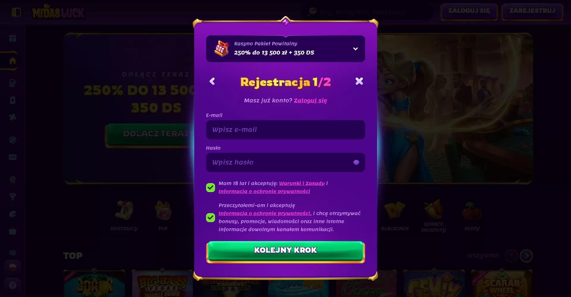 Otwórz MidasLuck.pl i znajdź przycisk “Rejestracja” w prawym górnym rogu.