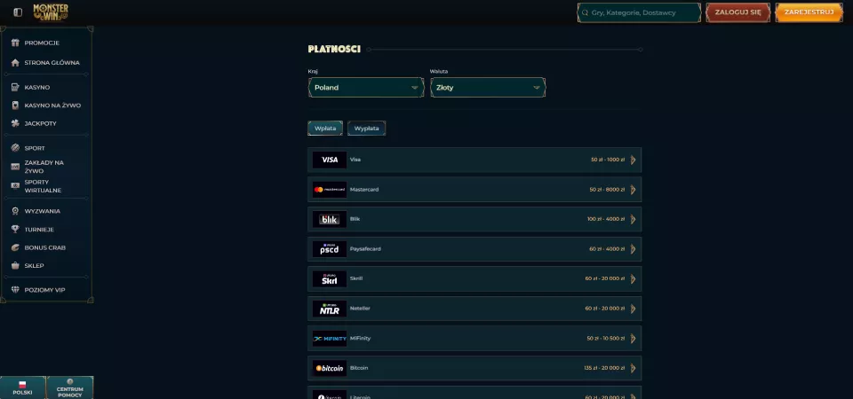 Najpopularniejsze metody płatności? Karty MasterCard, e-portfele typu Skrill Neteller, lokalne rozwiązania jak BLIK i Paysafecard. Kasyno przyjmuje też kryptowaluty – Bitcoin, Doge, Litecoin. To sporo ułatwia dla tych, którzy cenią szybkość i anonimowość. Minimalny depozyt w MonsterWin Casino zaczyna się od 50-100 PLN, zależy od metody.