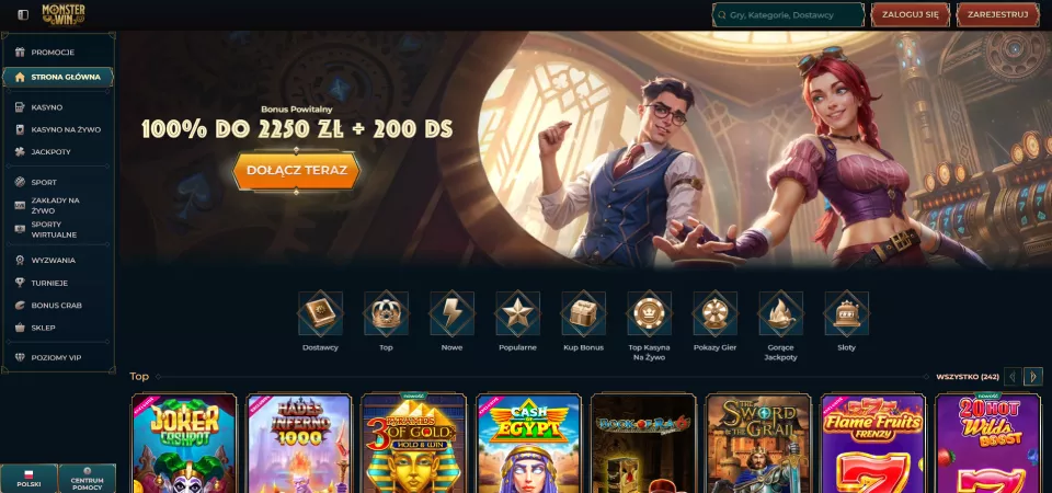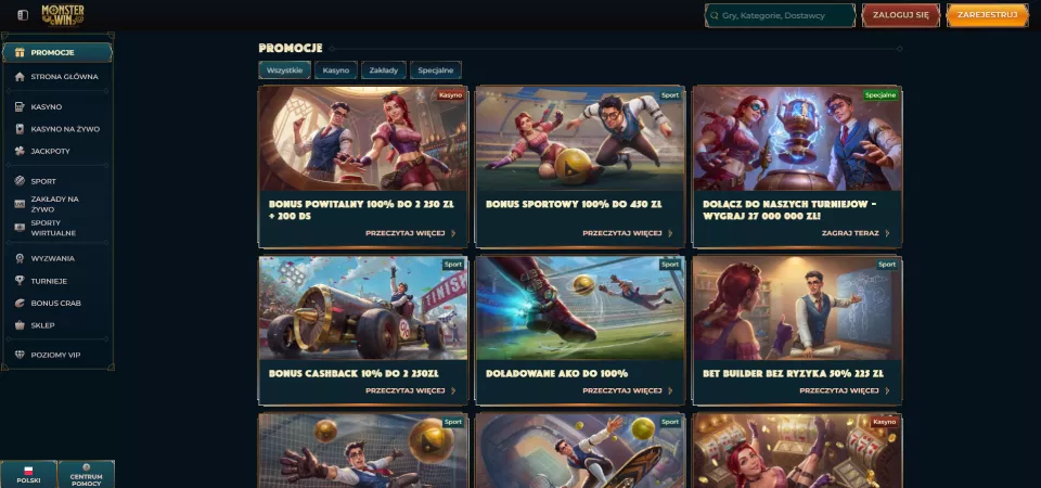 Nowi gracze dostają pakiet powitalny – 100% do 2250 PLN plus 200 darmowych spinów. Poza standardowymi slotami i grami na żywo, MonsterWin wprowadził kilka ciekawych rozwiązań: Bonus Crab, sklep z nagrodami czy system wyzwań. Program VIP ma pięć poziomów, a aktywni gracze mogą liczyć na dodatkowe przywileje i wyższe limity przy wypłatach.