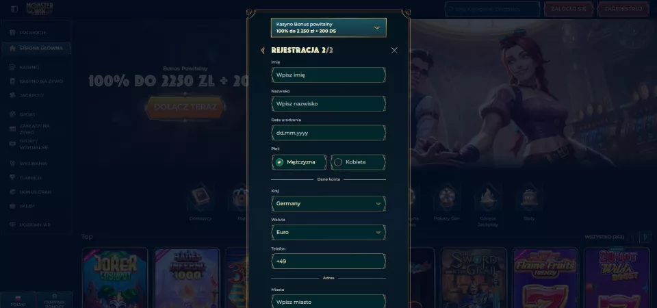 Wejdź na oficjalną stronę Monster Win Casino, kliknij “Rejestracja” w prawym górnym rogu.