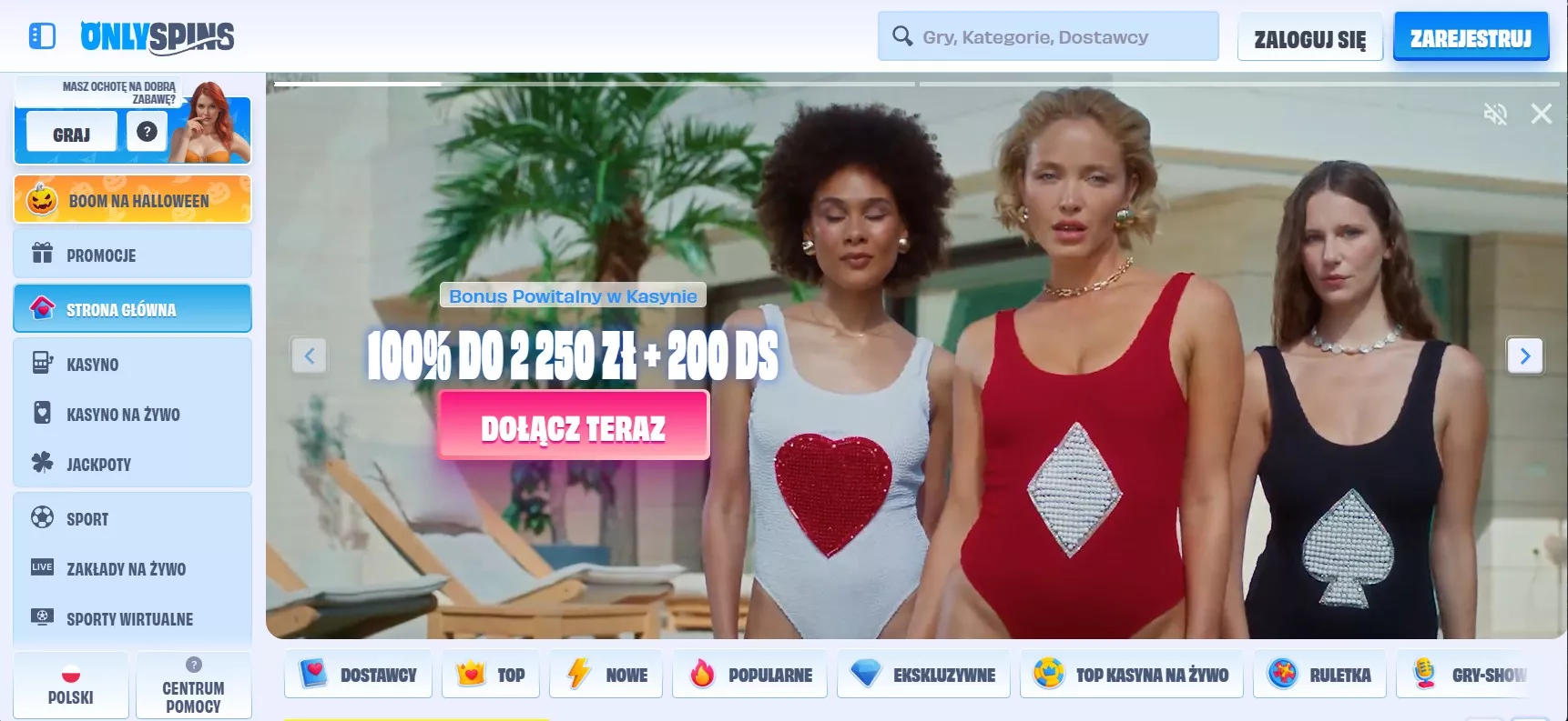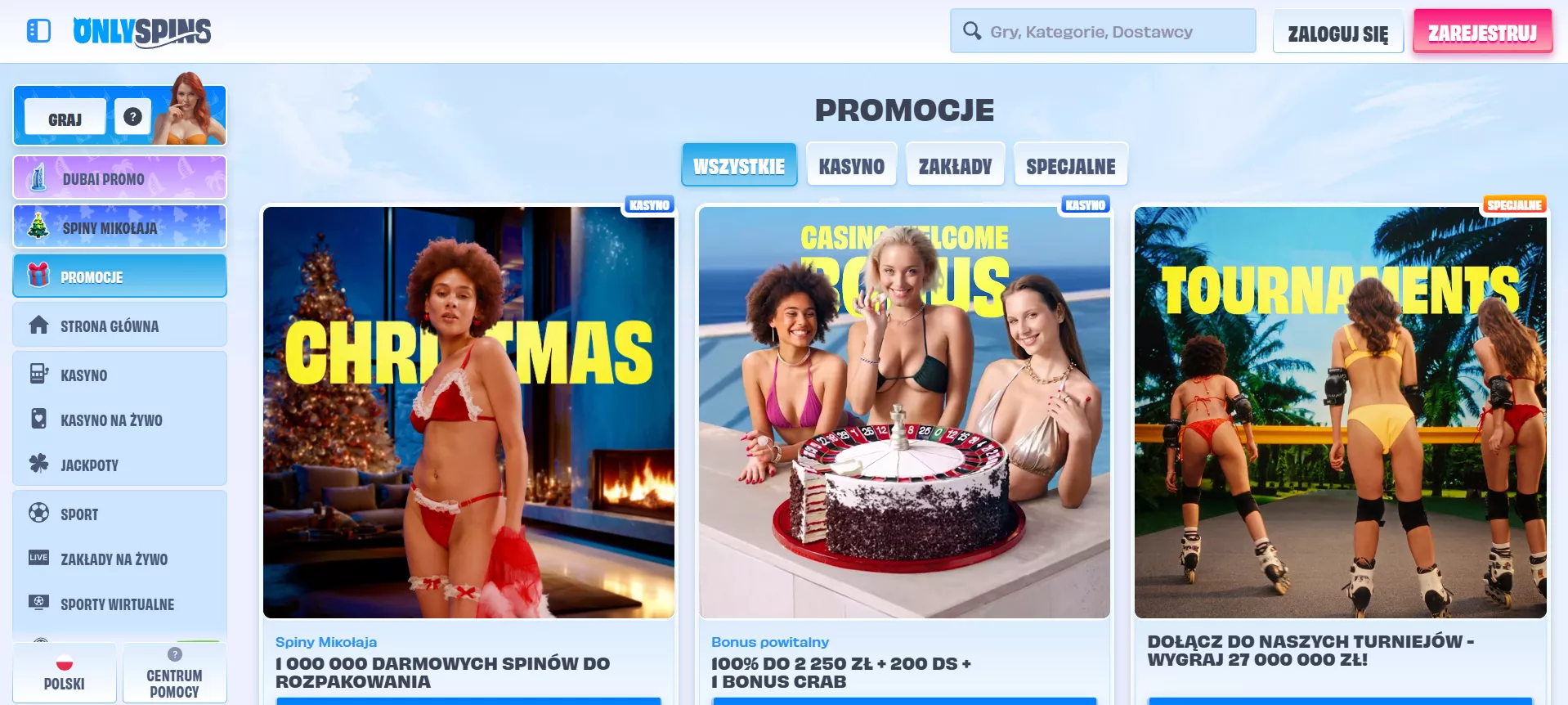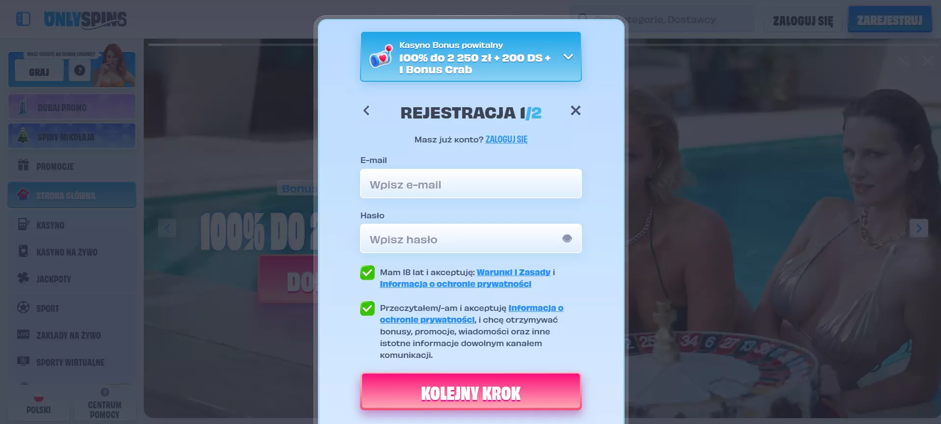 Wejdź na stronę główną OnlySpins Casino PL, kliknij „Zarejestruj się”