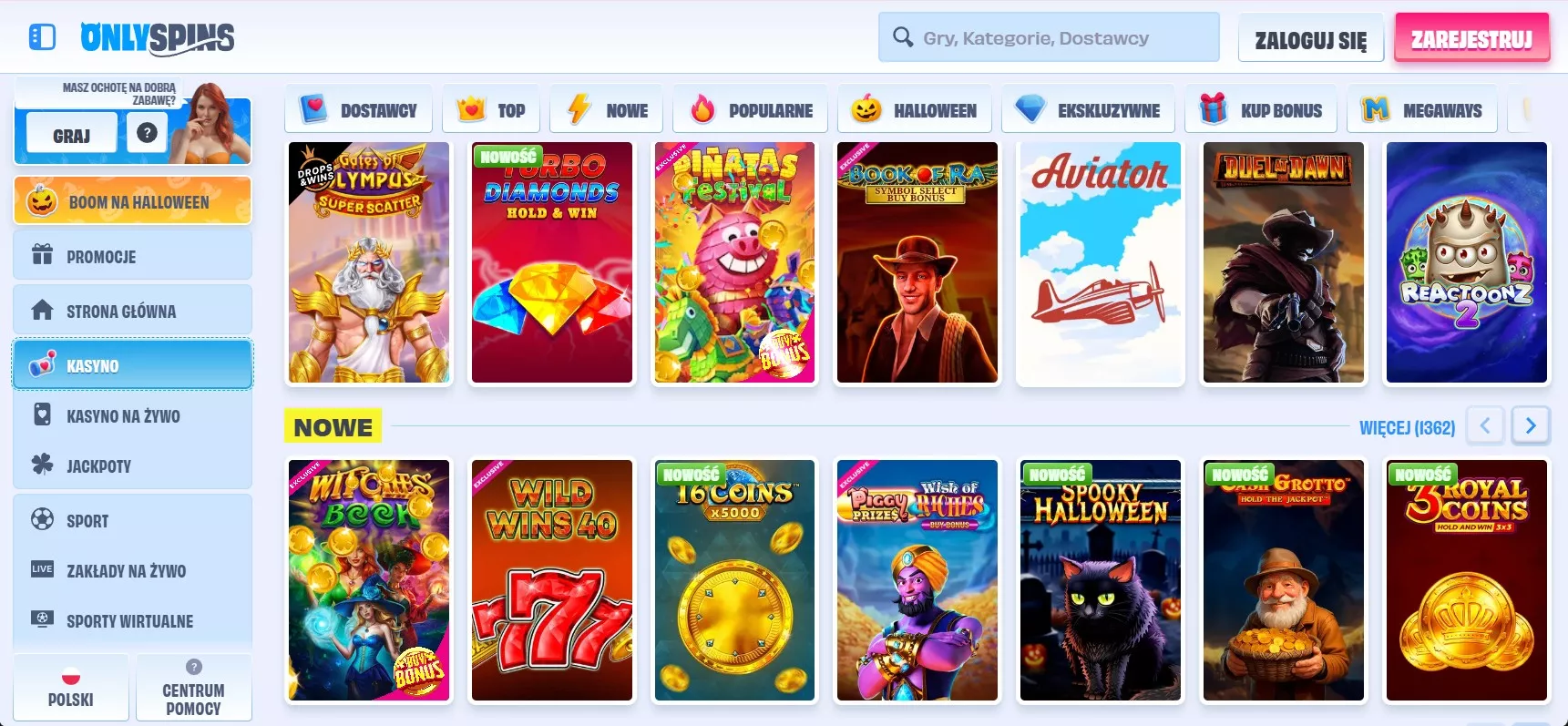 Biblioteka gier online ma ponad 11 000 tytułów od 100+ dostawców. OnlySpins Casino serwuje mnóstwo kategorii dla różnych gustów. W pakiecie: klasyczne automaty, gry stołowe, jackpoty progresywne, sloty z funkcją zakupu bonusu, sekcja kasyno na żywo, popularne Megaways.