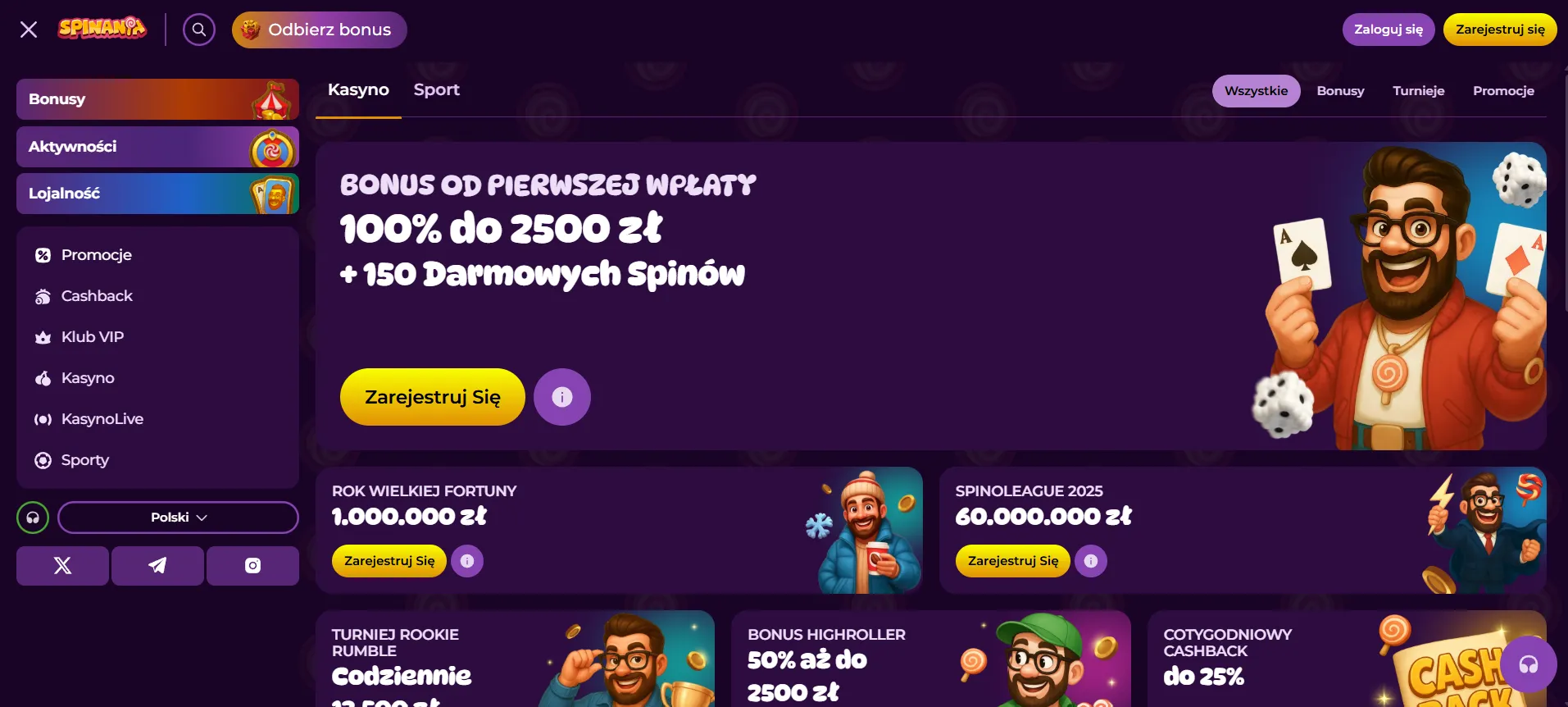 Spinania Casino to rzetelna platforma hazardu online z kompleksową ofertą dla polskich graczy. Spinania Casino recenzja pokazuje, że serwis stawia na różnorodność gier kasynowych, konkurencyjne bonusy i wygodne metody płatności. Pakiet powitalny 100% do 2500 zł ze 150 darmowymi obrotami wypada mocno na tle legalnych kasyn online z międzynarodowymi licencjami.