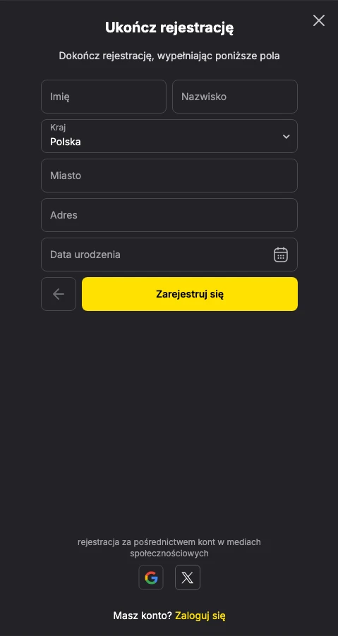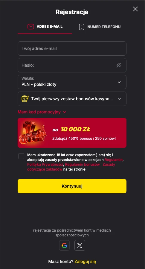 Casino pozwala też na szybkie logowanie przez Google i X (dawniej Twitter). Ta opcja przyspiesza dostęp – nie trzeba pamiętać dodatkowych haseł.