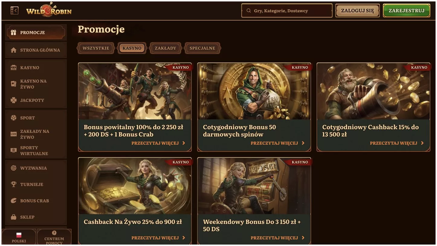Żeby aktywować WildRobin casino bonus powitalny, zarejestruj konto i wpłać minimum 90 PLN. Dostaniesz 100% dopasowania do 2250 PLN, 200 darmowych spinów (po 20 przez 10 dni) oraz 1 Bonus Crab. Warunki obrotu to x35 dla premii gotówkowej i x40 dla spinów, masz na to 10 dni.