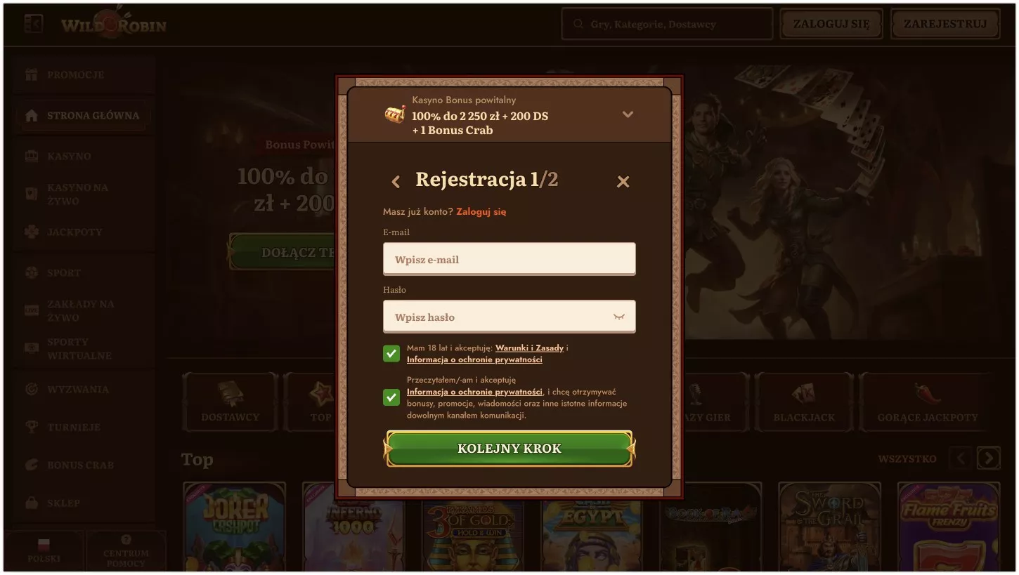 Logowanie i rejestracja w WildRobin Casino