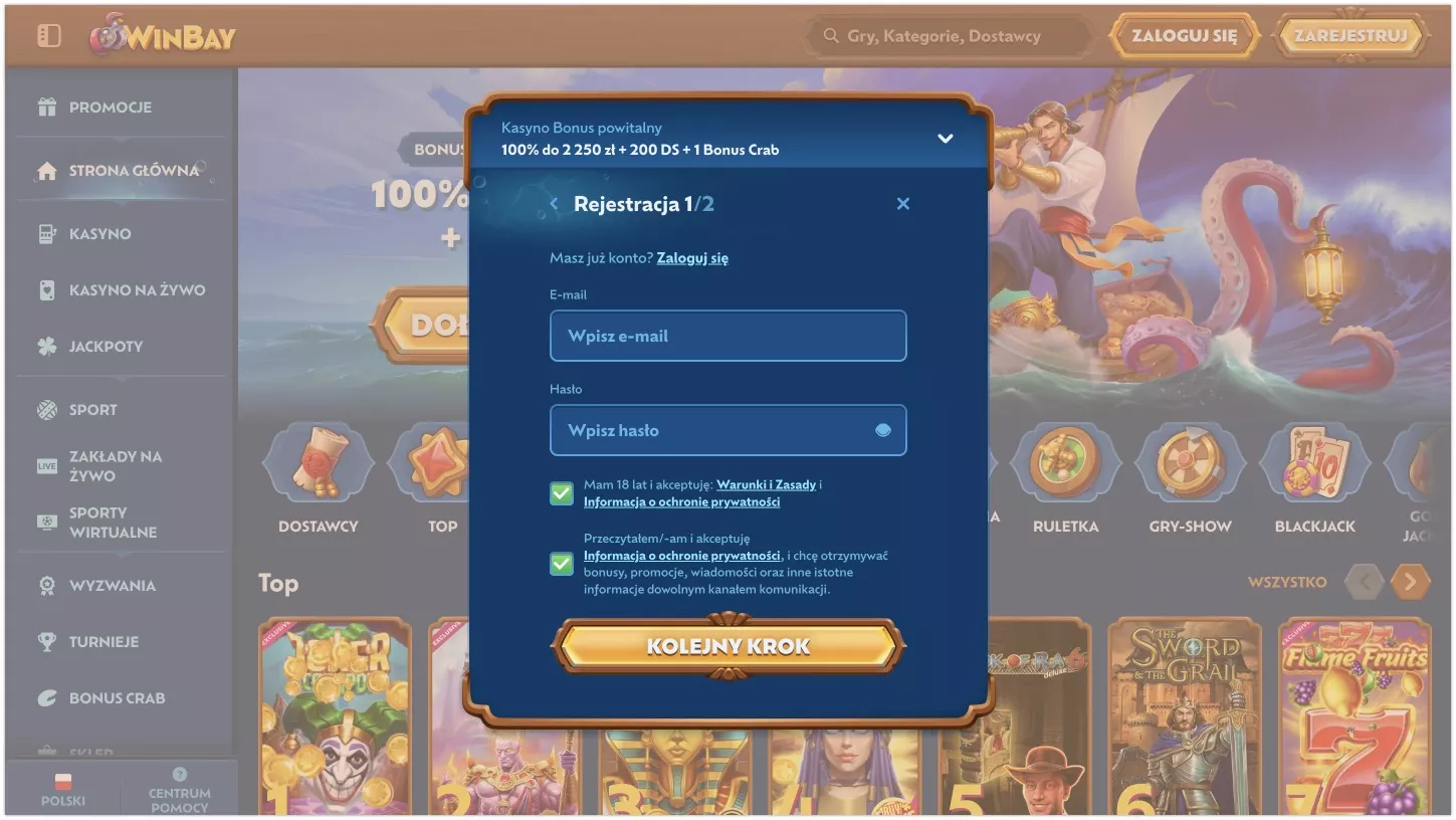 Winbay Bonus Powitalny przypisze się automatycznie po pierwszym depozycie. Możesz też wpisać kod promocyjny SLOTERMAN1 na dodatkowe korzyści. System rejestracji jest bezpieczny – wszystkie dane lądują zaszyfrowane.